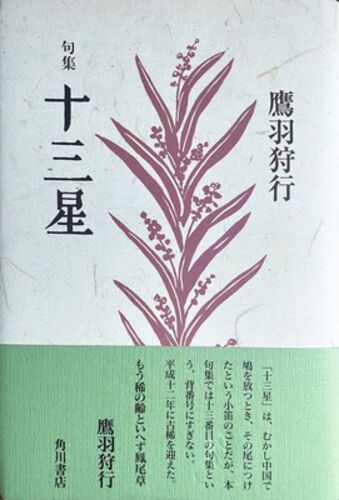 2001年9月、角川書店から刊行された鷹羽狩行(1930~)の第13句集。装幀は熊谷博人。著者は山形生まれ、刊行時の住所は横浜市港北区。 「十三星」は、むかし中国で鳩を放つとき、その尾につけたという小笛のことだが、本句集では十三番目の句集という、背番…